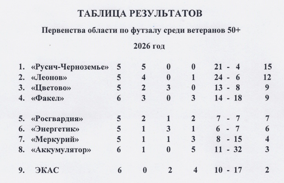 Результаты матчей 6-ro тура Первенства области по футзалу среди ветеранов 50+: 21.«Аккумулятор» - ‹Цветово» - 3-4 (К.Томаров-2, Г.Сайков; А.Пучков-2, М.Стариковский-2)