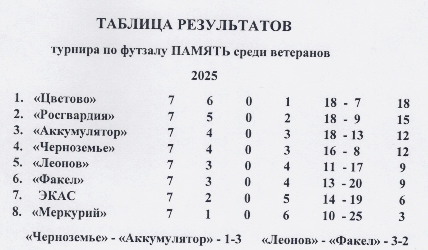 В матчах 6 тура турнира по футзалу среди ветеранов 50+ «ПАМЯТЬ», состоявшемся 29-30 ноября зафиксированы следующие результаты: 21. «Черноземье» - «Факел» - 4-0 (Д.Кутузов, С.Мосолов, П.Плотников, автогол)